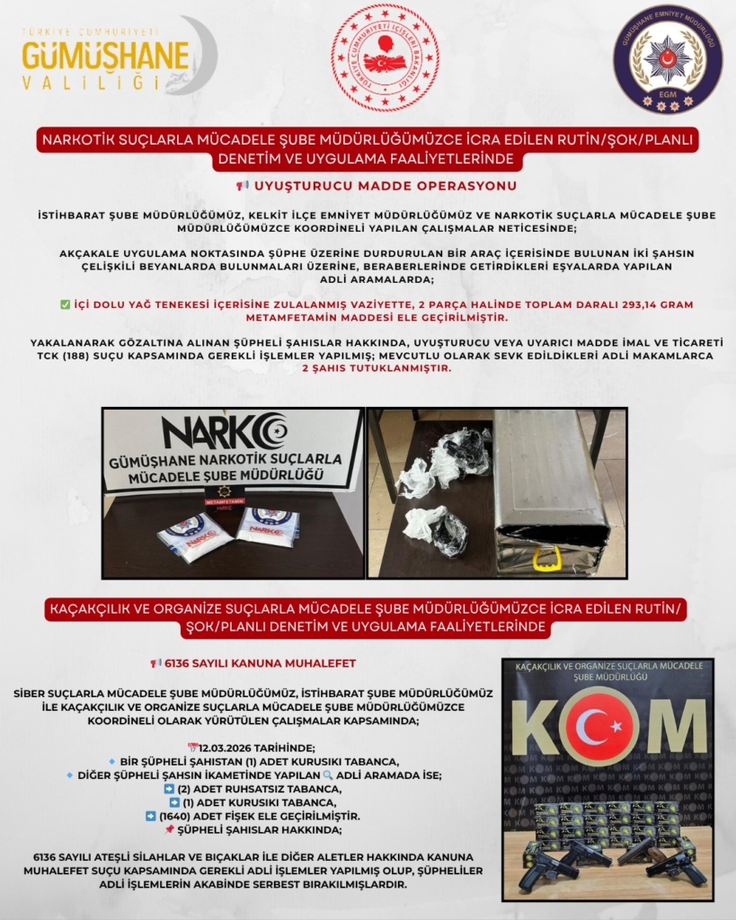 Gümüşhane’de kamu düzeni ve vatandaşların huzurunun sağlanmasına yönelik çalışmalar hız kesmeden devam ediyor. Gümüşhane İl Emniyet Müdürlüğü tarafından son 15 gün içerisinde il genelinde gerçekleştirilen denetim ve uygulamalarda dikkat çeken sonuçlara ulaşıldı.