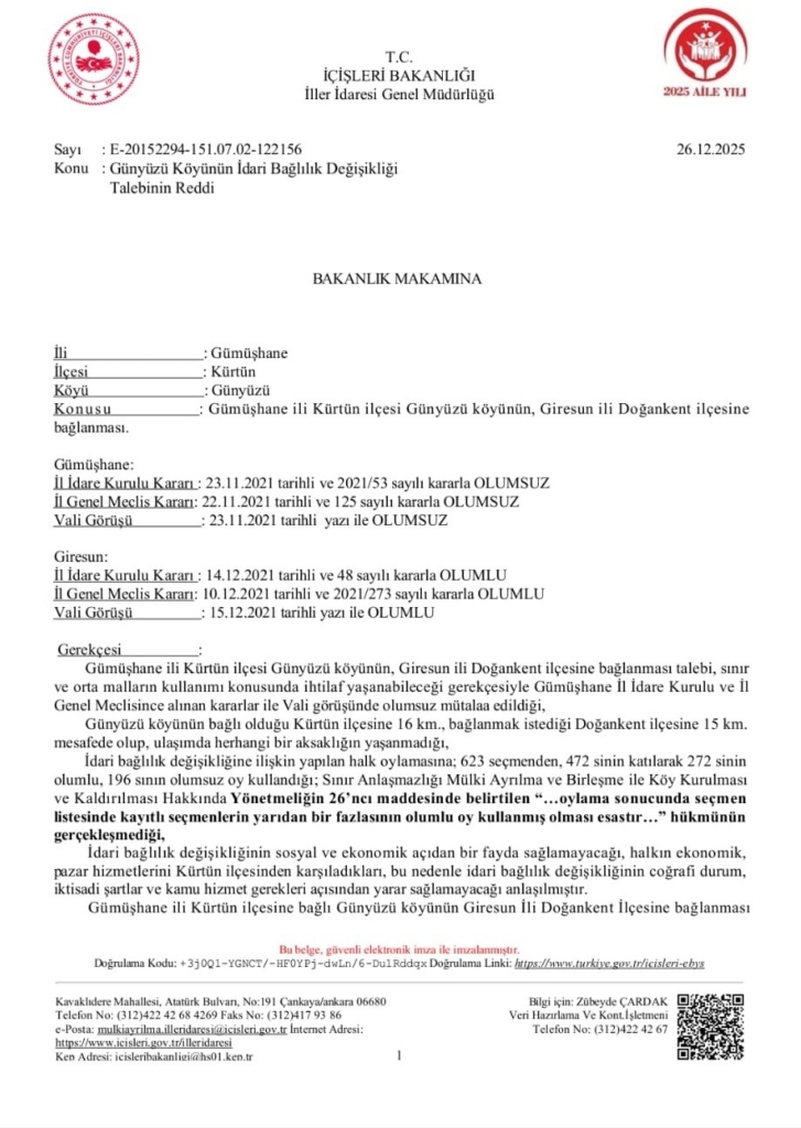 Günyüzü köyünün idari olarak Giresun’a bağlanma talebi, İçişleri Bakanlığı tarafından gerekçeli olarak reddedildi.